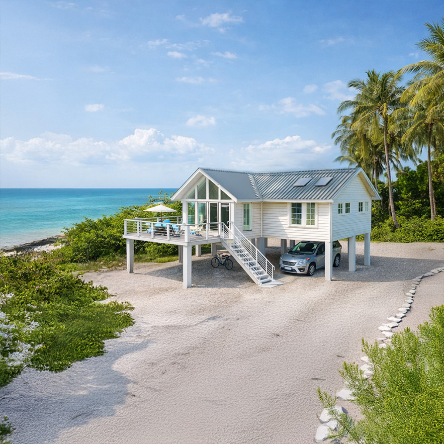 Pedestal homes are Topsider Homes trademark home design. Each pedestal home is custom designed to meet the needs of our clients. They are perfect mountain homes or beach house plans, easily adaptable to any terrain, severe climate or remote building site. With our tropical home package upgrades Topsider Homes are hurricane-resistant, seismic resistant and low maintenance in salt air and tropical climates. The perfect kit home building plan for your cabin in the mountains, vacation getaway, garage or home addition. (Return to Collections Selections)